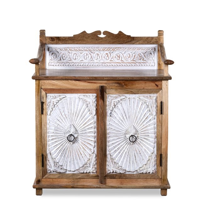 Bring timeless craftsmanship and vintage charm into your home with this handcrafted solid wood cabinet bench. Featuring beautifully carved white distressed door panels and an elegant backrest design, this piece blends traditional artistry with practical functionality.