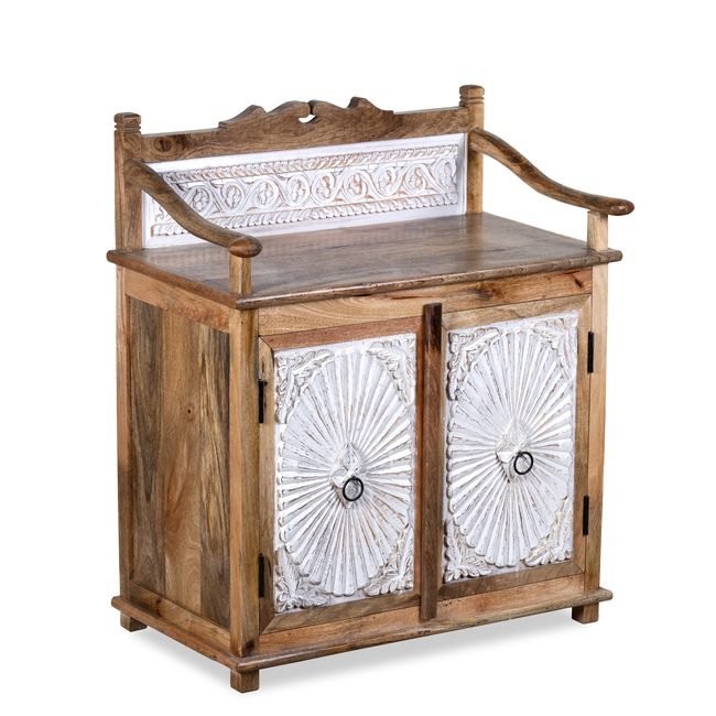 The sturdy wooden frame and comfortable armrests create a bench-style top surface, while the spacious double-door cabinet provides concealed storage for household essentials. The contrast of natural wood tones and distressed white carvings adds rustic character, making it a perfect statement piece for entryways, bedrooms, or living spaces.