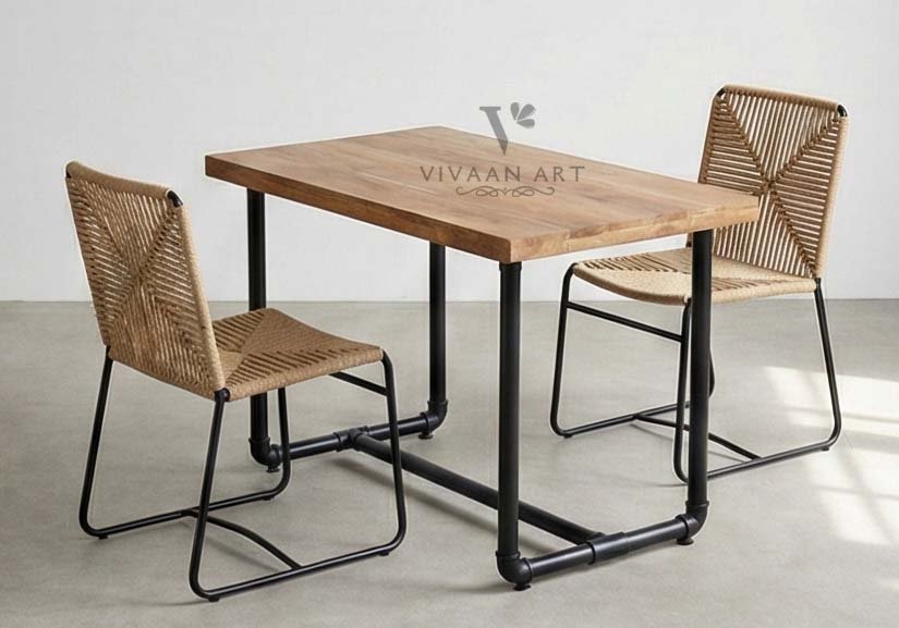 Bring modern rustic charm into your dining space with this beautifully crafted 2-seater dining set. Featuring a solid wood tabletop with a natural grain finish and a sturdy industrial-style metal pipe base, this table blends durability with timeless design. The accompanying chairs are designed with a sleek metal frame and handwoven rope seating, offering both comfort and visual elegance.