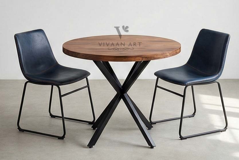 Round Solid Wood Dining Table Set with Cross Metal Base & Leatherette Chairs (2 Seater)