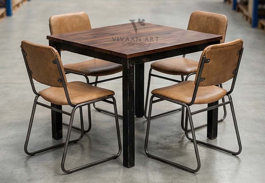 Solid Wood Dining Table with Upholstered Chairs | Modern Industrial 4-Seater Dining Set